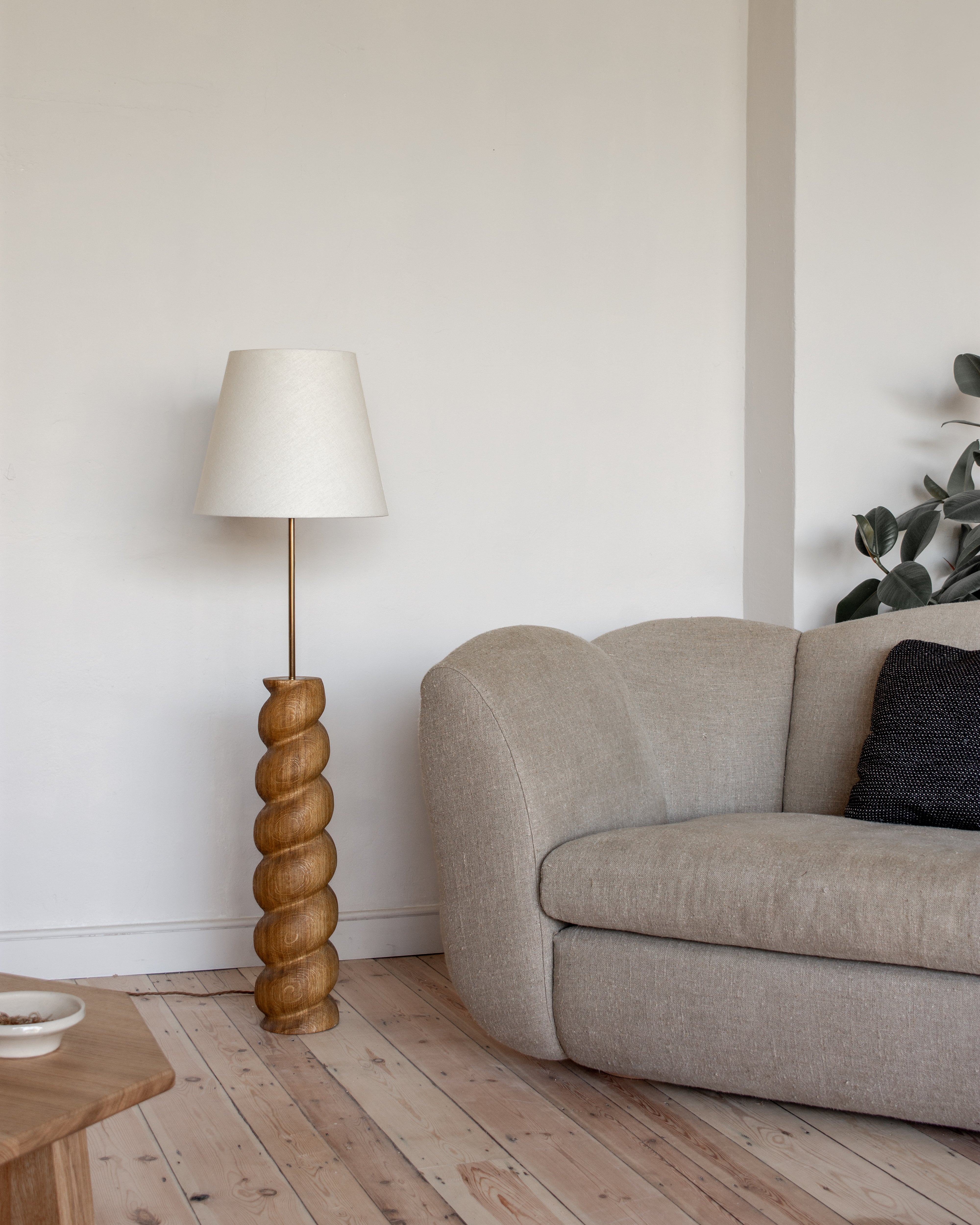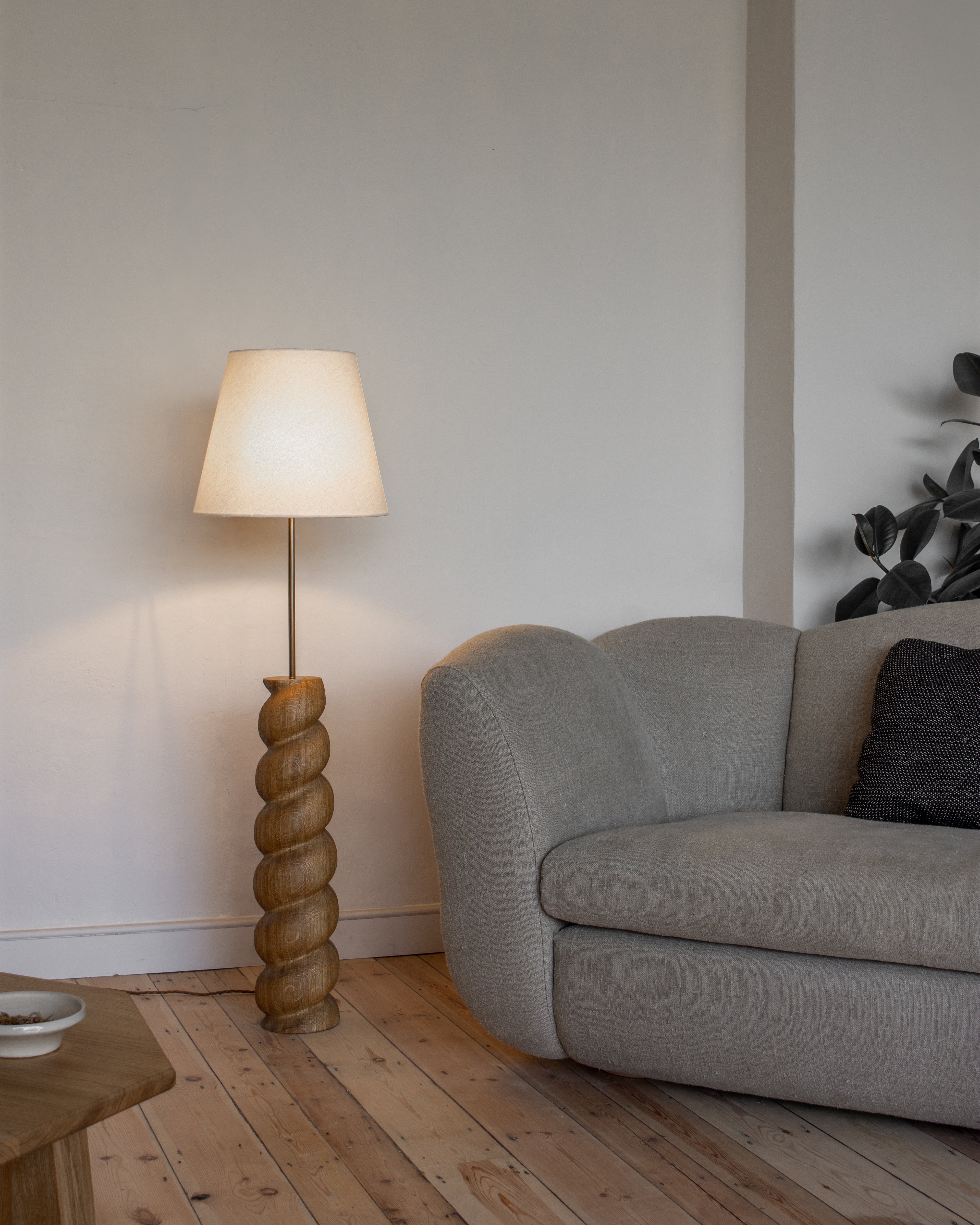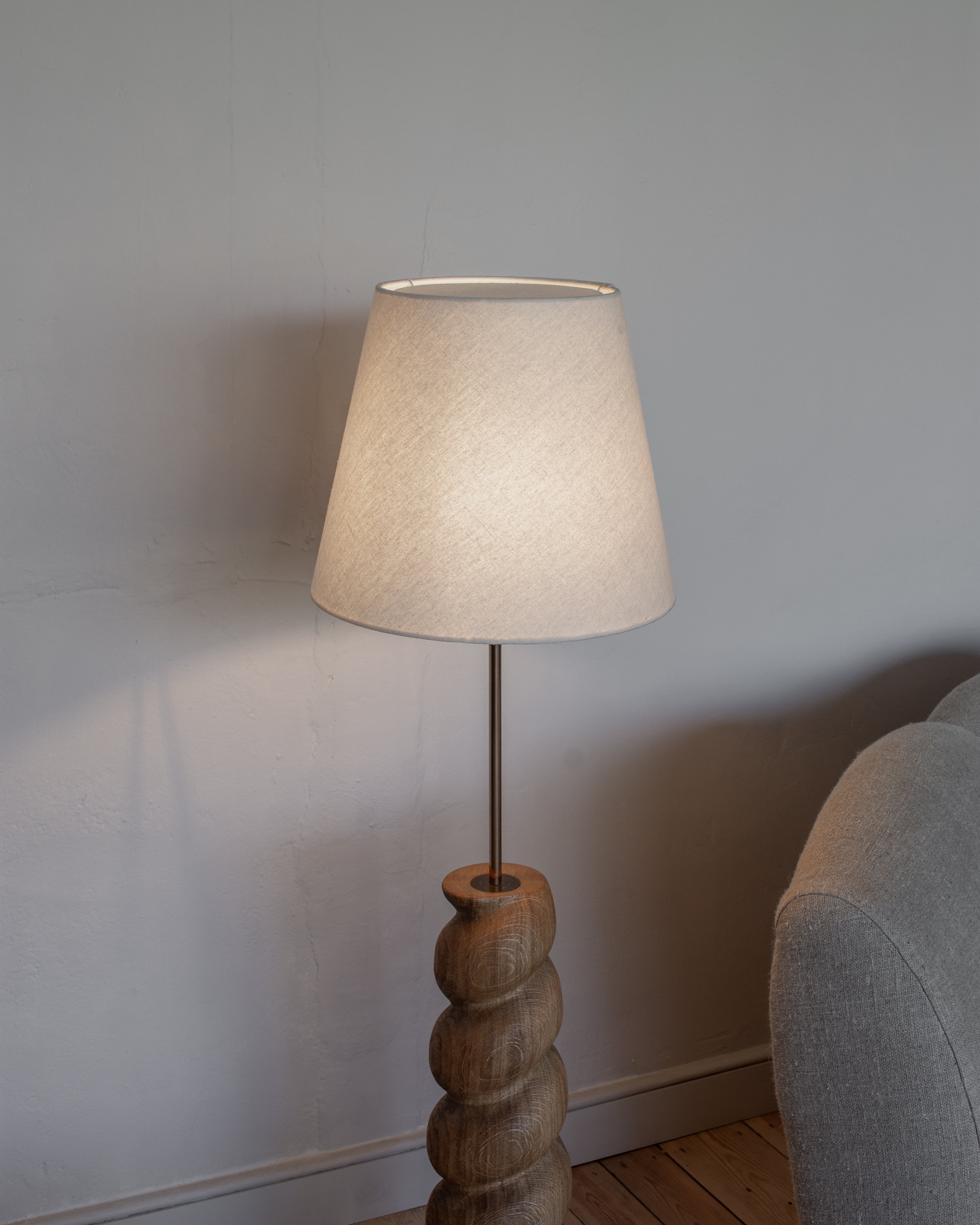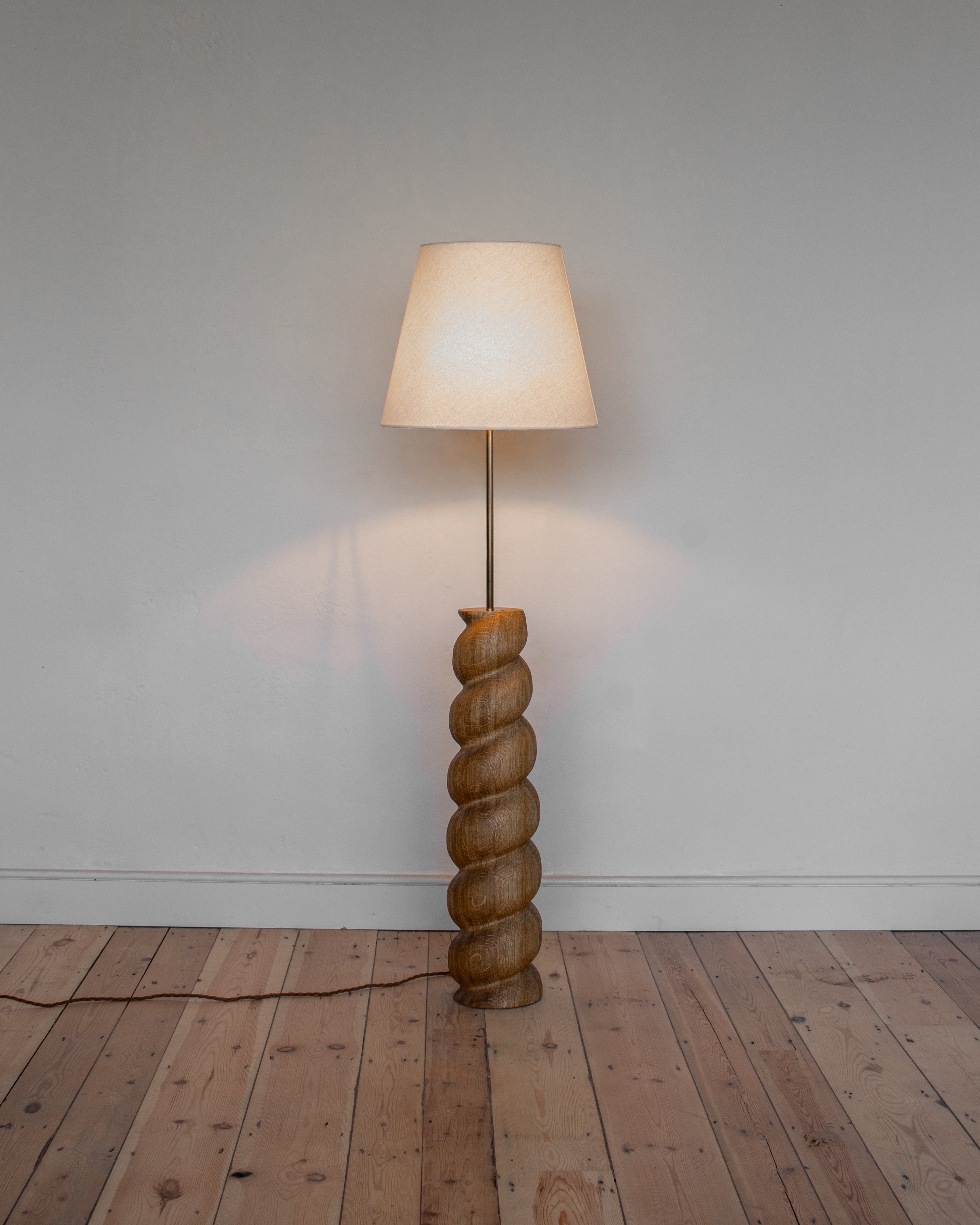 The Caracol Floor Lamp is a sculpture in its own right, with a playful and dynamic presence. Turned and carved by hand, the solid timber base is crafted in much the same way as the classic barley twists which inspired it.